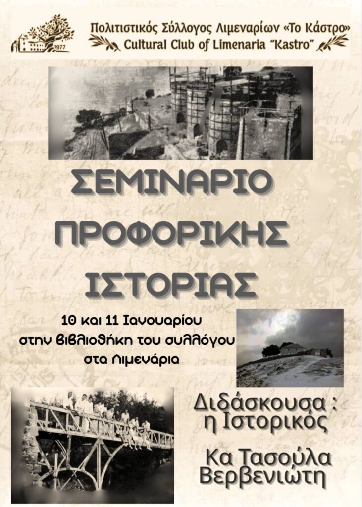 Σεμινάριο Προφορικής Ιστορίας διοργανώνει ο Πολιτιστικός Σύλλογος Λιμεναρίων «Το Κάστρο», στις 10-11 Ιανουαρίου 2026 στην βιβλιοθήκη του συλλόγου.